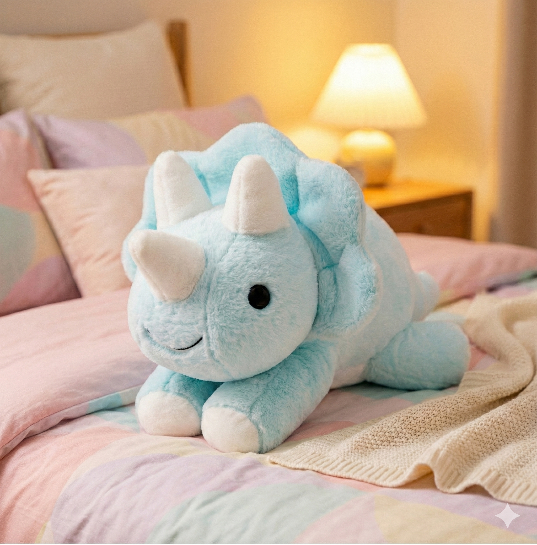 My daughter sleeps so much better with her blue triceratops! It's the perfect weight to help her feel calm and secure at bedtime.